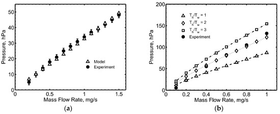 Measurements of the cathode pressure were performed and compared with the theoretical results from the numerical model. Figure 6a reports the cathode pressure measured at room temperature (no discharge), at xenon mass flow rates from 0.2 to 1.5 mg/s. The presented data are in excellent agreement with the values predicted by the pressure model. Figure 6b shows the cathode pressure during operation in diode mode with the keeper electrode alone, with a current limited to 3 A. The cathode pressure increased from about 5 to 130 hPa (namely, from about 3.8 to 97.5 torr), when the mass flow rate was increased from 0.1 to 1 mg/s. The theoretical pressure at the highest mass flow rate (i.e., 1 mg/s) is in reasonably good agreement with the measured one for a ratio of the plasma heavy particles temperature and the wall temperature between 2 and 3, which is in agreement with the experimental findings by Williams [15]. On the contrary, the model slightly over-predicted the pressure value recorded at the lowest mass flow rate (i.e., 0.1 mg/s), even when considering the heavy particles in a thermal equilibrium condition with the cathode walls. A fixed ratio of the plasma heavy particles temperature and the wall temperature does not provide good agreement of the computed pressure with the experimental values as a function of the mass flow rate. This occurrence is likely tied to the influence of the plasma parameters on the ion energy, which affects the charge exchange mechanism between ions and neutrals, and in turn the neutral gas temperature.