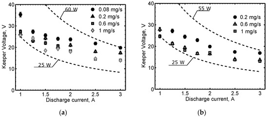 Electrical characteristics of HC60 operating with the keeper alone at different mass flow rates: (a) Xenon; (b) Krypton.
