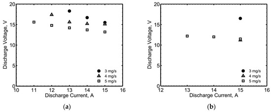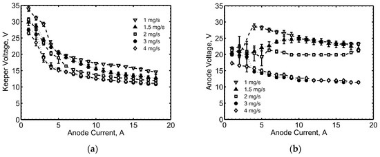 HC20 post-endurance characterization with krypton, at 2 A keeper current and different mass flow rates: (a) Keeper voltage vs. anode current; (b) Anode voltage vs. anode current.