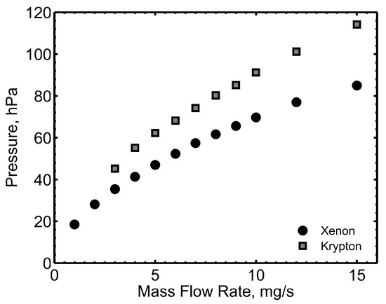 The cathode pressure at room conditions was measured with both xenon and krypton, with the values reported in Figure 14. At a given mass flow rate, the pressure with krypton is higher with respect to xenon, due to lower atomic mass of krypton. In its heaterless configuration, the cathode was ignited with a keeper voltage between 800 and 950 V, with a mass flow rate of 12 mg/s. The keeper current was limited to 15 A. With a heating power of about 170 W, the cathode was ignited with a mass flow rate of 5 mg/s, at a keeper voltage in the range between 450 and 500 V. The ignition parameters showed no significant variations with both xenon and krypton.