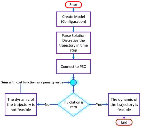 where refers to a certain constraint as already explained. In addition, and represent the physical quantity and target constraint respectively. Now with the violation functions definition in Equation (28), the boundary conditions in Equation (25) can be satisfied. For obstacle avoidance, the Euclidian distance between the edge of the object and the quadrotor is used []. The whole algorithm is sketched in Figure 3.