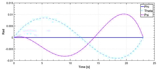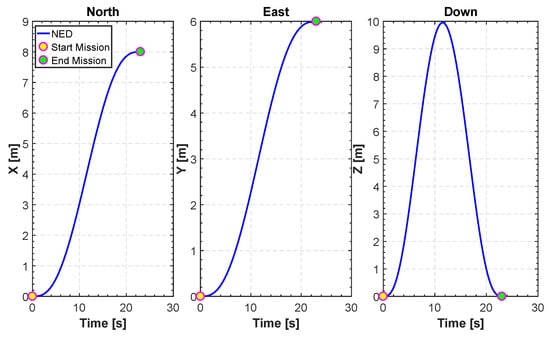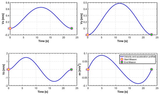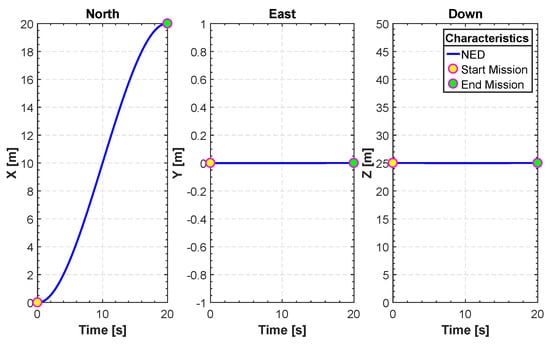 In Figure 12, Figure 13, Figure 14, Figure 15 and Figure 16, we report an example of trajectory belonging to the Scenario 2 (TML). In particular, the starting point is and the landing point is . The maximum altitude during the flight time is 10 m. Also, Figure 17 shows the minimum length trajectory (J = 33.9608 m) which is obtained after 100 iterations of the PSO algorithm. Figure 15 represents the inertial frame for the velocity components, which are less than 1.5 m/s according to our constraints definition in scenario two and the total flight time is 23 s.