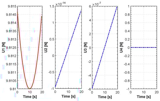 The inverse kinematics of our model that are referred to as control inputs of the quadrotor according to Equation (15) are: