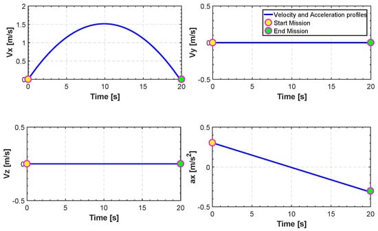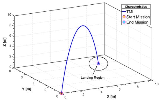 In all kind of UAVs, take-off, mission and landing (TML) are crucial. The challenge in modeling this scenario is the tuning of the parameters of the B-spline in a way that: (1) the velocity profiles of the trajectories during take-off and landing are zero (rest-to-rest manoeuvre); (2) the absolute value of the velocity should be less than 1.5 m/s; (3) the Euler angles during take-off and landing are zero (rest-to-rest manoeuvre); and (4) the quadrotor reaches the specific altitude (10 m) during the flight time. Clearly, other constraints can be defined. For simplicity, the surface of the ground is assumed to be horizontal. The length and duration of the trajectory between take off and landing can be made variable. Further details about modeling this scenario are reported in Section 4 and numerical examples in Section 5.