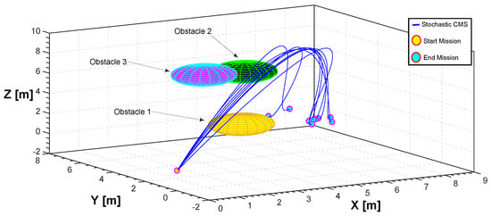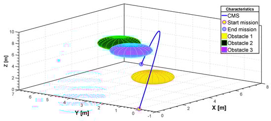 The third considered scenario highlights the ability of our approach to model trajectories that comprise obstacle avoidance procedures. Static obstacles with different size can be defined in the flight space. In particular, we consider three obstacles. Finding a safe and short trajectory in the search space with obstacles becomes a challenging problem in path planning. On the other hand, according to the configuration of our quadrotor, the feasibility of these trajectories is also significant. Boundary constraints for complex maneuver in 3D space are defined in Equation (25). More details are reported in Section 5.