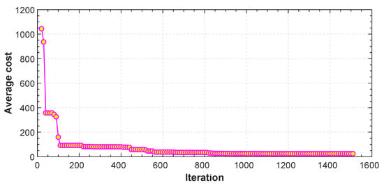 In this section, first we report a summary of example parameters to be used to generate trajectories in the three considered scenarios. The proposed algorithm can be used for any configuration of UAVs, but herein, we focus on a quadrotor. A number of parameters is initially fixed as shown in Table 2 []. Furthermore, in each flight scenario the start point, end point and a number of control points are defined by the user. We also report the number of particles and the number of iterations run by the PSO for the generation of trajectories with a certain number of control points. The details for each scenario are given in Table 3. The number of iterations listed in Table 3 to obtain the minimum length path are needed for the convergence. The average cost metric as a function of the iterations will be shown in Section 5.1, Section 5.2 and Section 5.3 for Scenarios 1, 2 and 3, respectively. The execution time has been computed for a simulation setup with an Intel i5 CPU with 3.3 GHz, and RAM of 4GB using MATLAB 2016b. Finally, we demonstrate the performance of our method in comparison with the standard (A*) algorithm, the standard rapidly-exploring random tree (RRT*) algorithm and the genetic algorithm (GA) for obtaining the minimum length path in 2D.