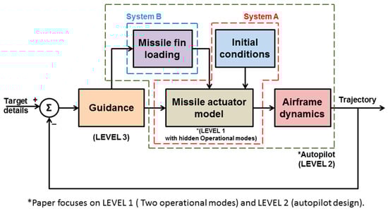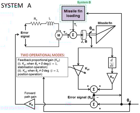 The block diagram indicating the missile guidance architecture utilised in this paper is shown in Figure 1. In the proposed system, the actuator has two parts: System A and System B. System A consists of the DDEA for driving the missile fin, which also considers the initial conditions of the missile fin position. It is a position servo system that can be used both for positioning (set point inputs) or missile stabilisation functions. The actuator model is a conventional servo system with proportional and derivative control. The load torque is algebraically estimated based on the missile aerodynamic flight conditions for the given fin geometry utilising a gain scheduler feedforward based control strategy.