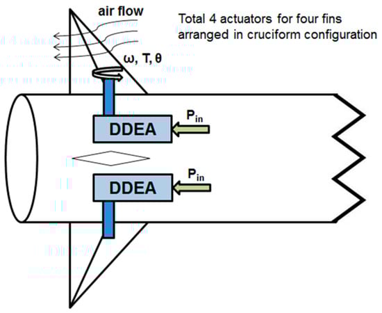 A direct-drive electric actuator (DDEA) is used for the missile fin actuation. The general schematic of the actuator, fin and the missile are shown in Figure 2. A DDEA normally has a negligible holding torque and as a result the actuator normally needs to be actively powered to sustain the fin at a desired position. Due to the range of flight conditions, the load torque as experienced by the fin will vary and requires continuous control action to maintain position. The DDEA is supplied with the required electric power (Pin) from the missile on-board power system. It is assumed that the electrical supply provides a stabilised power irrespective of the actuator load demands. Figure 2 shows that the motor load due to the fin and aerodynamic forces are related to the missile speed and fin geometry. The aerodynamic forces are a function of the missile’s flight conditions and, more generally, the missile and fin geometry. Availability of the torque variable, and therefore the current, allows designers to investigate how the missile airframe manoeuvrability influences the torque demand for a range of test conditions as shown in Section 4. This results in improving the understanding of the fin actuator characteristics in relation to the airframe LATAX motion. This is significant, because it allows correlations of electrical fin-related variables and airframe motion variables. Figure 2 shows the DDEA, input power per actuator, the aerodynamic airflow, and fin motion variables.