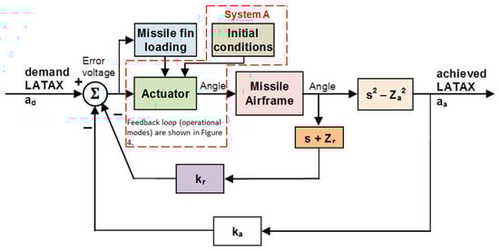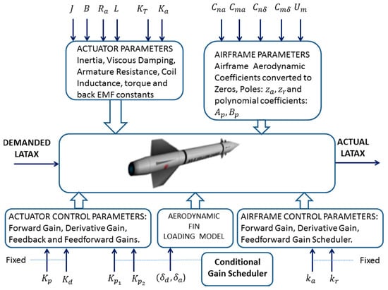 Figure 7 shows the system parameterisation in more detail and the parametric system complexity. The overall system transfer function (Equations (21) and (22)) allows investigation of how the airframe LATAX is affected in relation to the missile model parameters (including airframe and actuators and fin loading effect). The fin actuator parameters; the airframe aerodynamic parameters, which are then converted to system poles and zeros; and the feedback actuator (fin) conditional gain scheduler, together with the fin loading feedforward input and the airframe autopilot gains, all contribute towards a systematic understanding in relation to the actuator capability to perform fast enough for the airframe to respond rapidly. This is of critical importance for this application. Furthermore, the missile airframe LATAX dynamic response is related, as shown earlier in the analysis, to the actuator electrical demands, i.e., voltage and electrical current, which enables the designers to parametrically evaluate different electrical actuators for the same missile airframe.