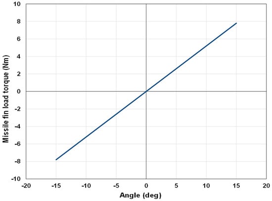 System B consists of load torque details required by the missile fin for the given aerodynamic flow conditions. Here, the missile flight speed is considered as Mach 2.0 and the associated load torque characteristics against the fin angle of attack between −15° and +15° is assumed to be linear with a slope of 0.52 Nm/°, as shown in Figure 5. The characteristic shown in Figure 5 is fixed for a given missile flight condition and geometry.