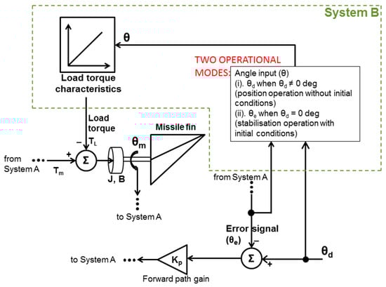 The missile can operate at different times in either a set point fin deflection mode, or an initial condition (IC) mode. Depending upon which mode the missile is operating in, the load torque is utilised from the error signal (θe) or from the demanded position angle (θd) respectively. In both cases the load torque characteristic against fin angle of attack is the same. The block diagram of System B is shown in Figure 6.