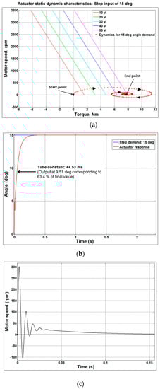 The step response corresponding to a demand of 15° over a time span of 0.5 s was fed as input to assess the various performance parameters of the actuator. The simulation results are presented in Figure 8.