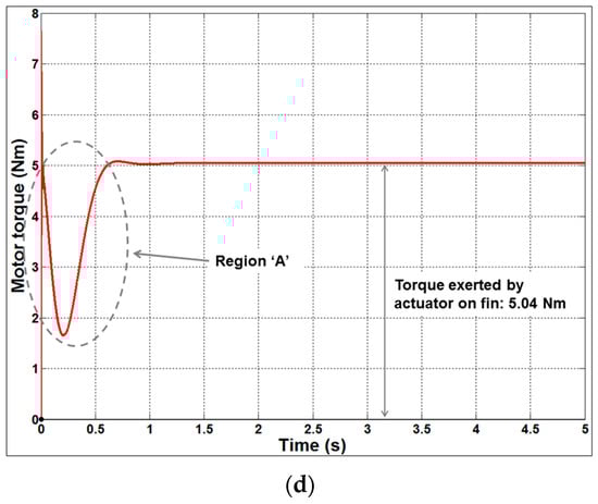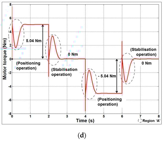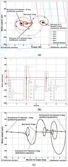 Figure 9a describes the static and dynamic characteristics of the actuator. It can be observed that, for the required inputs of +5°, 0° and −5°, the actuator starts from 0 rpm and 0 Nm and at the end, the motor speed goes to 0 rpm and the torque settles at 2.6, 0 and –2.6 Nm, respectively, i.e., at the load torque required for the missile fin at Mach 2.0. It can also be observed from Figure 9d, that the positioning and stabilisation operations are successfully achieved with very low steady-state error and with the same time constant. Figure 9e confirms that the actuator exerts the required torque to hold the missile fin in its position.