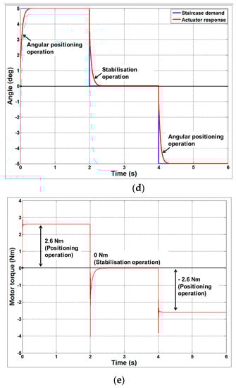 The staircase input corresponding to angular demands for position operation followed by a stabilisation operation further followed by a second position operation in the negative direction was generated with position demands for ±5° and a stabilisation demand of 0°. Each demand had a 2 s time period. The simulation results are presented in Figure 9.