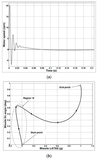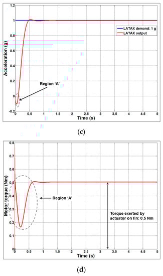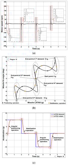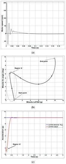 The plots in Figure 12 depict satisfactory performance of the LATAX autopilot with the proposed actuator fin angle for a staircase LATAX demand. In each of the LATAX demands, the actuator supplies the required torque to hold the missile in a given position at Mach 2.0. The effect of zeroes in the autopilot, also known as the non-minimum phase effect (due to the tail fin control), is marked as “Region A”. Thus, it can be observed from the simulation results for various scenarios that the performance of the proposed actuator alone and along with the dual-feedback LATAX autopilot for a tail-fin-controlled missile is satisfactory and operates within the actuator bounds (Figure 8a). It may also be noted that the actuator architecture is functioning satisfactorily for both stabilisation and position control operations and, hence the proposed actuator design can be used for any of the operations.