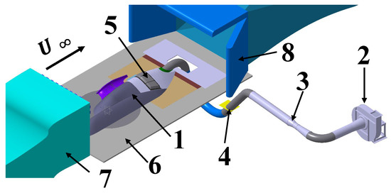 The geometry’s inner components (Figure 3c) are connected to the engine air intake (Figure 3b). The inner components are the engine plenum chamber (EPC) and the engine intake duct (EID). The engine plenum chamber is attached to the engine air intake. It embeds the engine intake duct, which is a nozzle leading to the AIP. In contrast to the real helicopter, in the experiment, the circular duct is extruded in the direction of the engine’s axis downstream of the AIP. Figure 4 presents in detail the components and their connection. To reproduce typical fast forward flight operation conditions (cf. [19]), angles of yaw between can be adjusted in the experiments. In the coordinate system of the real helicopter, the resulting angles of attack are and the sideslip angles are .