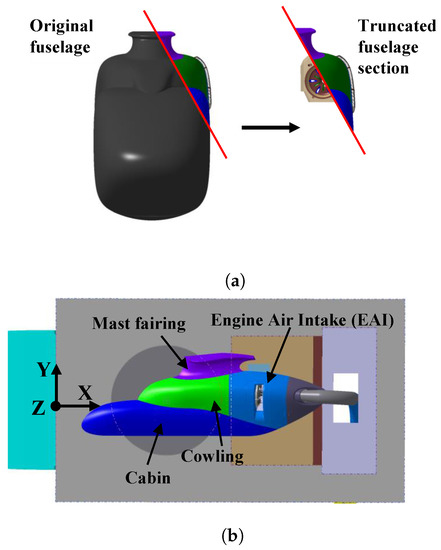 Local Mach and Reynolds number similarities are fulfilled simultaneously by full-scale model testing. The W/T model’s outer geometry represents a fuselage part model, see Figure 2a. The main rotor influence in fast forward flight is small for the portion of the fuselage where the intake section is situated, cf. [17]. For a reduction of measurement errors, the blockage in the test section is kept at a level of 7–8%, as proposed in [18]. The result of the spatial restrictions due to test section dimensions is a truncated fuselage section, which is depicted in Figure 2a,b. The truncation of the fuselage led to a reduction of the longitudinal extent from 6 m to 4.5 m comparing the full fuselage and the truncated fuselage section.
