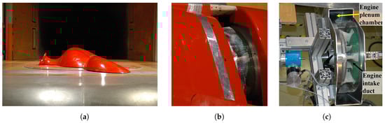 (a) W/T fuselage section in front view; (b) intake 2 in perspective view; (c) detail view of integration of the W/T model’s inner components.