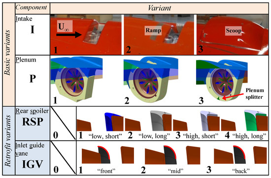 Figure 5 gives an overview of the intake geometries tested in the W/T campaigns. The basic variants are combinations of three intakes and three plenum chambers, cf. [13]. The basic geometries and their characteristics are only briefly summarized, whereas the retrofit modifications and their geometric parameters are presented in more detail.