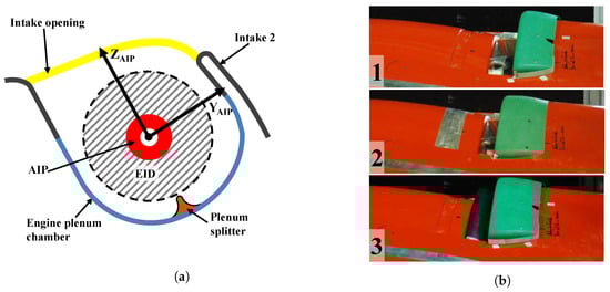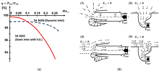 (a) Air intake efficiency, wind tunnel tests, based on [24]; (b) schematic of intake flow field (1) dynamic intake at , (2) static intake at , (3) dynamic intake at , (4) static intake at , based on [10].