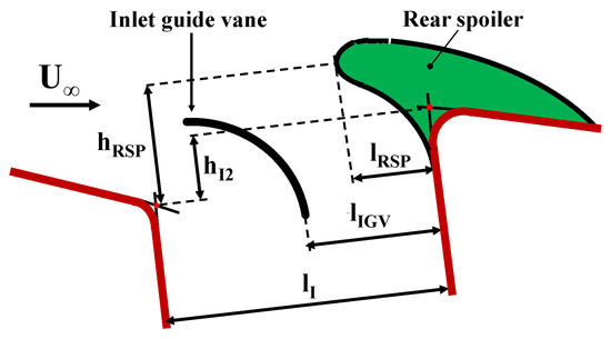 The rear spoilers are meant to increase the static pressure upstream of the intake opening (ram effect). The purpose of the intake guide vane is to support the deflection of the ingested air around the front intake lip (see Figure 6b and Figure 7) for a reduction of separated flow regimes directly downstream of the intake lip as achieved in [20]. The intake guide vane’s relative position is defined by the relation of its trailing-edge position from the back intake lip relative to the overall axial extent of the intake opening. All parameter values are given in Table 2. In the following, the basis for the optimization, namely the Intake 2 and Plenum 3 combination, is denoted as “baseline”.