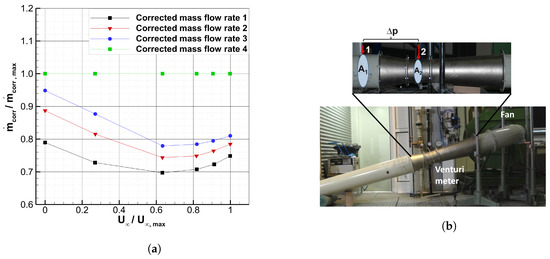(a) Specified mass flow rate as function of the specified freestream velocity ratio ; (b) venturi meter installation.