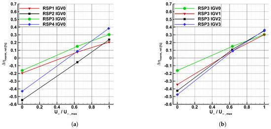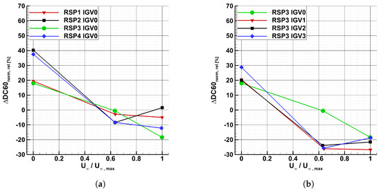 Relative difference in compared to baseline configuration in dependence of freestream velocity ratio, for (a) retrofit rear spoilers; (b) retrofit rear spoilers with intake guide vane.