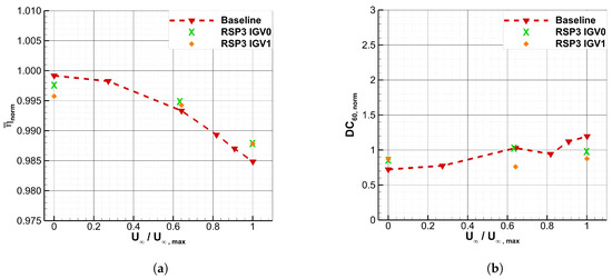 AIP coefficient progression of baseline configuration and best retrofit variants for (a) normalized total pressure ratio; (b) normalized distortion coefficient.