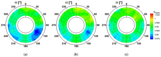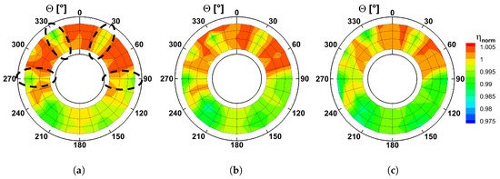 The regions corresponding to highest losses are located very similarly for the three configurations. The small differences in (cp. Figure 12b) are not clearly identifiable from the AIP distributions. Especially in the upper AIP region, characterized by overall high dynamic pressures, wakes of the EID guide vanes are visible for and . The corresponding deficits are shown exemplarily in Figure 13 and marked with black dashed circles. The fact that the wakes are not transported in circumferential direction shows that in this regime the radial direction is the prevailing inflow direction at the EID entry.