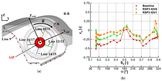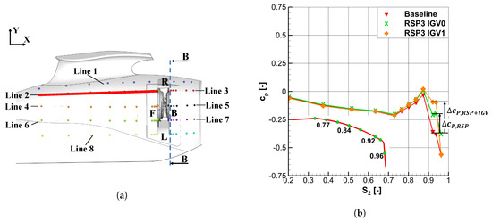 A local curve length coordinate S is defined for each line. The coordinate S ranges from 0 to 1 and its orientation is along the surface in mainstream direction. Subsequently, the front intake lip pressure distributions of Line 2 are analyzed for the baseline intake in comparison to the best two retrofit variants, RSP3 + IGV0 and RSP3 + IGV1, Figure 15b. The longitudinal section through the model at Line 2 is also illustrated (red line), together with the corresponding coordinate S for the surface pressure tap locations (green dots). The fast forward flight operation condition (, ) is regarded. Directly at and downstream of the front intake lip, at the location , the high and short rear spoiler (RSP3) increases the pressure level comparing to the baseline intake variant by , as illustrated in Figure 15b. The retrofit variant including the intake guide vane leads to a pressure gain of indicating a less pronounced separation region at the front intake lip.
