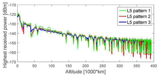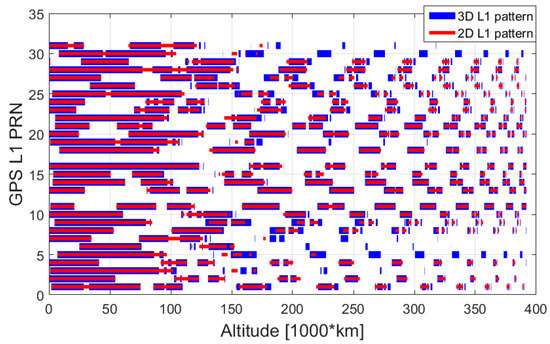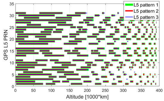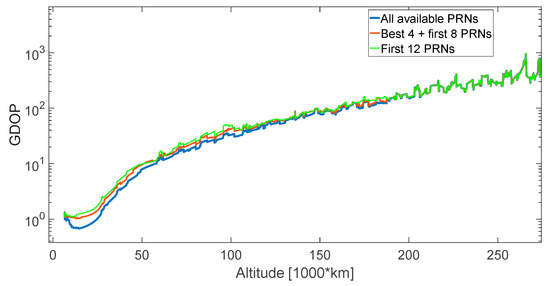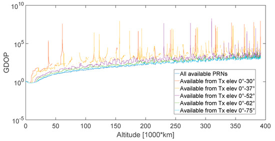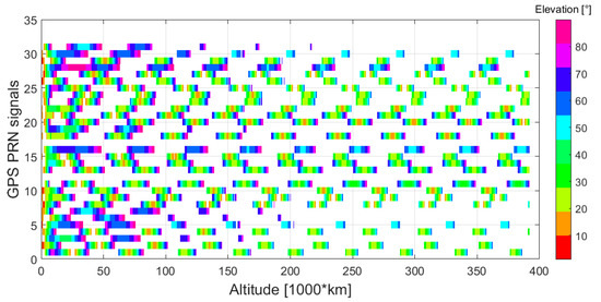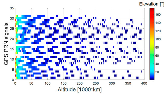 In this study, we did not define any PRN selection strategy based on the elevation at the receiver’s antenna, since the definition of the specific spacecraft’s attitude dynamics over time (that depends on the specific mission) as well as of the pattern of the receiver’s antenna(s) placed on the spacecraft would be needed. However, it is possible to predict the elevation at which the signal is transmitted. Then, by assuming a certain transmitters’ antenna pattern, for a certain altitude (and accordingly for a certain free space loss), it is possible to determine the signal’s power at the receiver’s position based on the estimated free space loss, and determine whether the same signal can be processed or not.