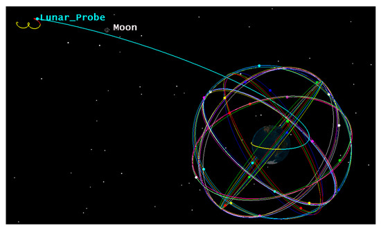 The initial time of investigation is 18:10:00 on 1 July 2005, while the launch of the vehicle was performed earlier. The investigated part of this study is propagated until 05:11:12 on 6 July 2005, which corresponds to the end of the blue curve (Moon altitude); it experiences an impulsive acceleration of 3.14217 km/s2 in the x-axis, at time 18:41:37:154 on 1 July 2005, to change the orbit from LEO to HEO with a perigee at Moon altitude. The initial earth centered inertial (ECI) position and velocity coordinates of the investigated trajectory are (−6188.944987; 1742.455236; 1155.838277) km and (2.484942; −6.510775; 3.563661) km/s, respectively.