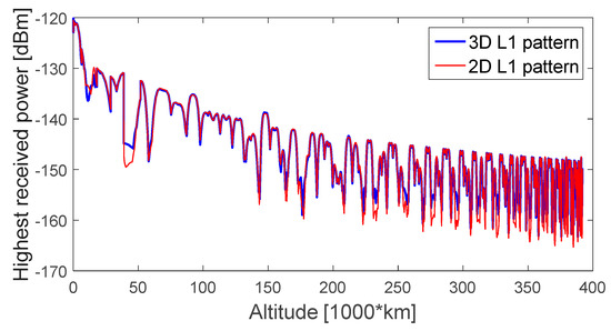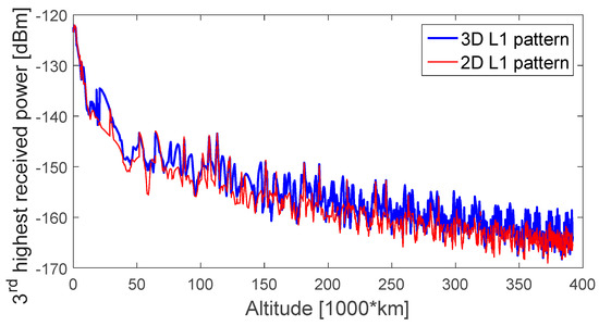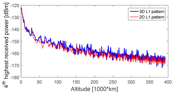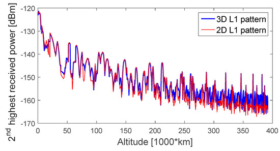 As a minimum of four signals are required for a standalone GPS navigation solution, Figure 6, Figure 7, Figure 8 and Figure 9 display the first-, second-, third-, and fourth-highest received power levels of the GPS L1 C/A signals at the receiver position as a function of the altitude, during the full considered trajectory, when assuming a 0 dBi receiver antenna gain, when the GPS L1 transmitter antenna is assumed to have a 3D pattern (in blue) and a 2D pattern (in red). The highest received signal powers (Figure 6) are very similar for both assumed patterns, which is explained by the fact that the signal comes from the main lobe of the transmitter antenna pattern; the main lobe patterns are very similar for 2D and 3D patterns, as also shown in Figure 4, because the main lobe pattern is well specified and there is a very small gain variance for different azimuth angles. The second-highest received signal powers reflect more differences, mostly at the end of the trajectory, as most of these signals come from the side lobes, where the dependency of the transmitter’s antenna gain with the azimuth is more evident; the differences are more notable in the case of the third-highest received power during the entire MTO.