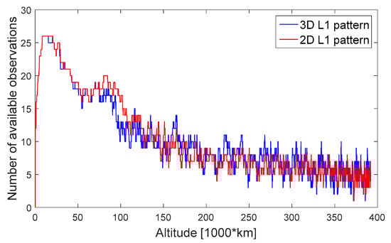 From this plot we cannot conclude for which pattern the availability is higher, however we can see that when assuming a 3D pattern it happens much more often to lose a satellite for a short time and track it again shortly after, compared to the case when we are using a 2D pattern. This is expected as, in the case of a 3D pattern, the gain might change a lot for different azimuth, more often causing a sudden loss of sight on a satellite. Another way to distinguish the impact of averaging the antenna pattern on the availability is to plot the total number of observations available, as shown in Figure 11. From this plot we can see that, depending on the portion, the availability might be higher for either a 3D or a 2D pattern. However, it is interesting to notice that in the case of a 2D pattern after 200,000 km altitude, the number of satellites available has a lower standard deviation compared to using a 3D pattern. Hence, in the case of a 3D pattern there are more outages, as well as more peaks in the number of satellites. The precise statistics on the availability are computed for the entire MTO as well as for three representative portions, as defined in Table 2. They are reported in Table 3, where the two assumed patterns are more concretely compared.
