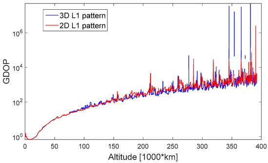 In Figure 12, the GDOP is shown. From this figure, it is difficult to assess which between the 3D or the 2D pattern leads to the worst GDOP; in some portion the 3D pattern has higher GDOP and in some other portions lower GDOP. However, at the end of the MTO for the 2D pattern the GDOP reaches its maximal value of 2.5 × 106, while, when we assume a 3D pattern, there are much more important peaks with a maximum of about 4.7 × 107, as shown in Figure 12.