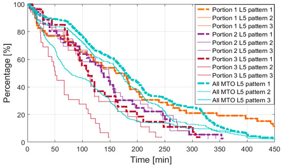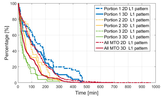 Another important piece of information related to the availability is the continuity of the signal as time interval duration when the signal is continuously available. This information is very useful for the acquisition module design. The continuity can be expressed in terms of percentage of continuous time intervals with the duration equal to or longer than a time interval T. This is shown in Figure 13 for both assumed patterns, for the full trajectory and the defined portions.