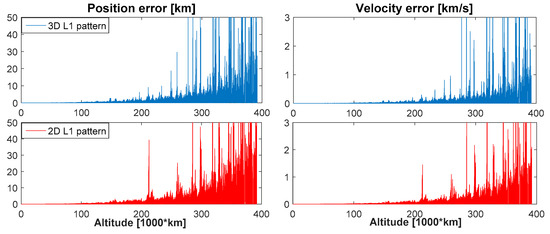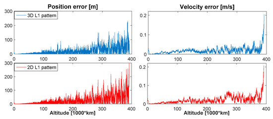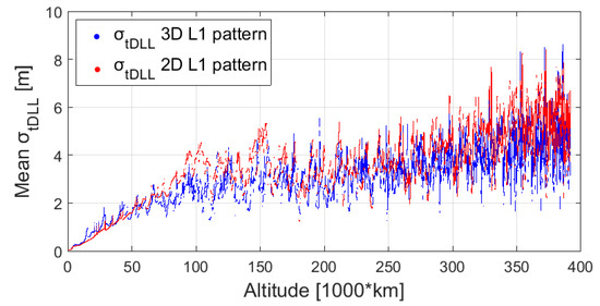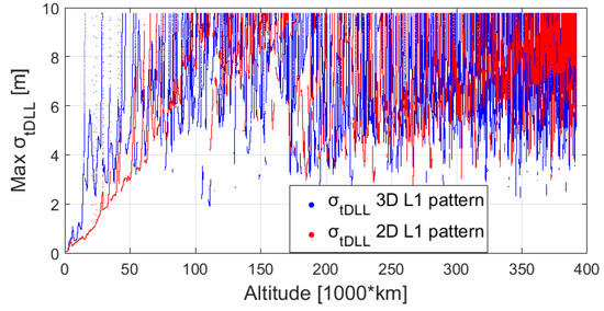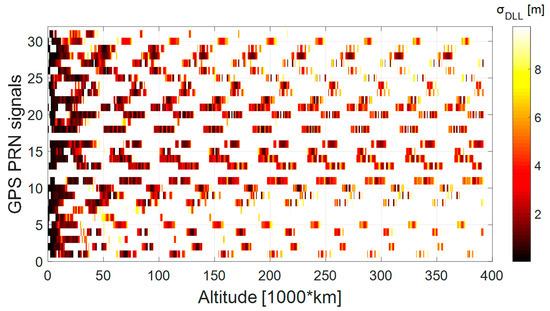 Figure 14 and Figure 15 show respectively the mean and max , assuming 10 dBi antenna gain for the receiver. The mean and max code tracking thermal noise error are computed among the signals available at the same instant. For instance, the for each available signal is displayed in Figure 16 in case of the 3D L1 antenna pattern assumption, as a function of the altitude. We can see from Figure 14 that it is difficult to state which antenna pattern (3D or 2D) would result in higher thermal noise, and thus ranging error. For example, at the beginning of the trajectory, up to 60,000 km, using the 3D pattern would bring a higher thermal noise, however from 75,000 km to 160,000 km using the 2D pattern would result in higher thermal noise. Finally, based on these results, using a 2D or 3D pattern would result in different for each pseudorange; however, when computing the mean , the difference becomes small. From Figure 15 we can notice that at the beginning of the trajectory, up to 50,000 km the maximal would be higher when assuming a 3D L1 pattern. It is important to note that the for both 3D and 2D patterns does not exceed a certain value (approximately 10 m), which corresponds to the weakest signals that the receiver can process due to its limited sensitivity.