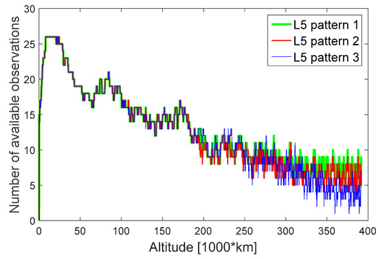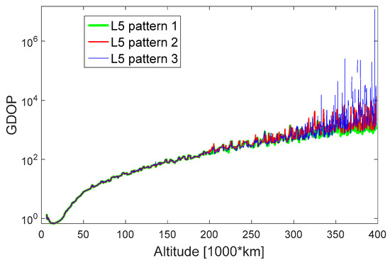 Figure 29 shows the zoomed least squares navigation solution for the three assumed L5 patterns. As we can see from this figure, for the entire MTO, when we assume L5 pattern 1 the navigation solution has lower error, while the largest error occurs when we assume L5 pattern 3. Indeed, this was expected as the number of satellites is bigger for L5 pattern 1, leading to better GDOP values. In the case of L5 pattern 3, the relative geometry between the receiver and the transmitters is quite bad, quite often reaching values above 10,000 at the end of trajectory (after 330,000 km), as explained in Section 4.2. Moreover, also the GDOP of L5 pattern 2 has more peaks compared to the one of L5 pattern 1, leading to worse positioning accuracy.
