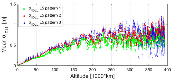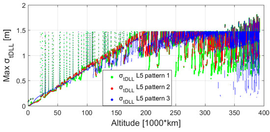 It is interesting to observe that the maximal up to 325,000 km does not exceed a certain value over time (we can observe a flat area at the top of the plots, which has an approximate value of 1.5 m). This value corresponds to the that the receiver experiences for the minimum that can be tracked (12 dB-Hz for the L5 signal). However, after 325,000 km the maximal reaches higher values. This is the result of the iono-free combination, for which, as shown in Equation (3), the variance is larger than the variance that corresponds to the process of only one frequency (L1 or L5) individually. In our tracking strategy we use a free iono-combination only when the signal is crossing the ionosphere. Signals crossing the ionosphere are also processed in an iono-free combination below 325,000 km, but below this altitude the receiver is also able to process weaker signals from the side lobes, for which the individual is larger.