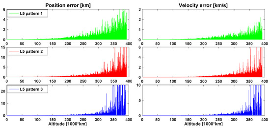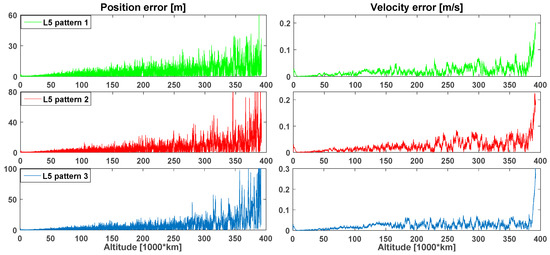 In Table 7 are shown the quantitative statistics of the navigation solution, for the three defined portions and the full MTO. The statistics for the full MTO confirm what can be seen in Figure 29. However, as shown in Table 7, the statistics for the entire MTO are strongly affected by the third portion, where the navigation performance is much worse for the third defined L5 pattern. Indeed, in the third portion the mean and standard deviation (1σ) of the position error estimation are less than 800 m, less than 1.6 km and several km for L5 pattern 1, L5 pattern 2, and L5 pattern 3, respectively. Also, the maximal error reflects a very big difference; indeed, it is only 6.6 km for the first pattern, more than 22 km for the second one, while for the last pattern it is more than 2000 km. For the first and the second portion, respectively, the difference of the position error estimation is about 0.2 m and less than 20 m among the three assumptions, in terms of mean and standard deviation (1σ). From Table 7 we notice that the velocity error statistics also reflect what was already shown in the position error statistics.