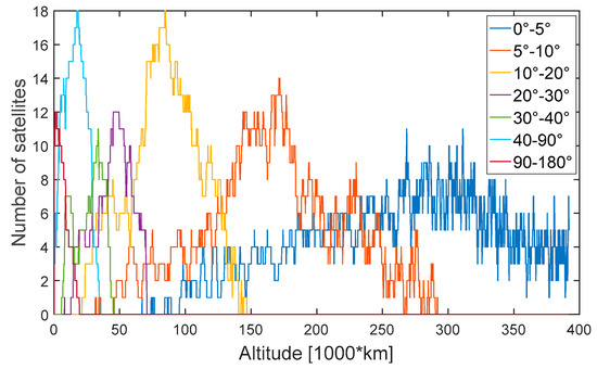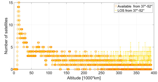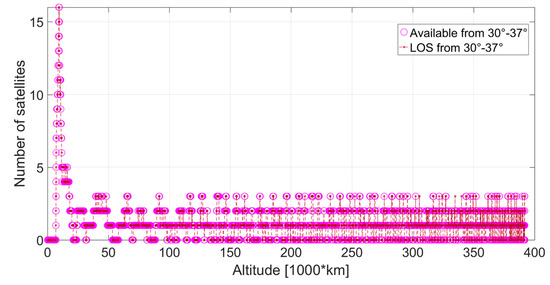 Figure 37, Figure 38, Figure 39, Figure 40, Figure 41 and Figure 42 show the visible satellites (in the line of sight (LOS)) and the available satellites at the receiver’s position, for which the corresponding signal is transmitted at an angle between 0° and 30°, 30° and 37°, 37° and 52°, 52° and 62°, 62°and 75°, and 75° and 90°, respectively, from the transmitter’s boresight. It can be observed that, if the signal is transmitted between 0° and 37°, it is almost always available at the receiver position, from the beginning to the end of the MTO. The signals in the LOS transmitted at angles between 37° and 75° are always available up to approximately 150,000 km of altitude, then available most of the time between 150,000 km and 250,000 km. After that, from 250,000 km to the perigee, a gradual decrease of their availability can be observed. More specifically, only one signal is available out of the four, five, or six transmitted between 37° and 52°. From 340,000 km, none of the signals out of the four transmitted at an angle between 52° and 62° is available. Finally, from 340,000 km, mostly a single signal is available out of the five, six, or seven transmitted at an angle between 62° and 75°. Not all of the signals but most of them transmitted from an angle between 75° and 90° are available up to 130,000 km; gradually fewer and fewer are available up to approximately 340,000 km, and mostly one signal (or sometimes none) is available above 340,000 km. It is interesting to note that above 340,000 km, although mostly not available because too weak, most of the signals are transmitted at an angle between 62° and 90°.