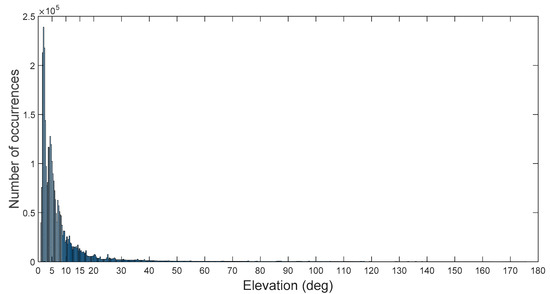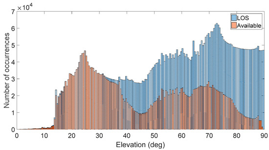 Histogram of the visible satellites (in the line of sight (LOS)) and of the available satellites (the ones from which the signal transmitted is strong enough to be acquired and tracked be the SANAG receiver) for each transmitter’s antenna elevation during the whole considered MTO.