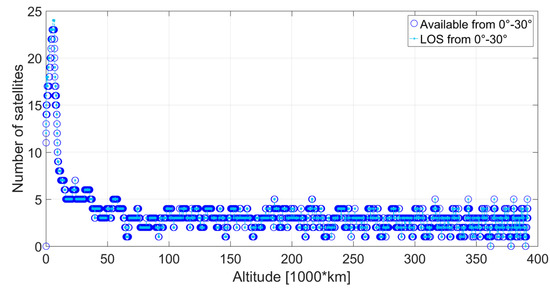 Visible satellites (in the line of sight (LOS)) and available satellites at the receiver’s position, for which the corresponding signal is transmitted at an angle between 0° and 30° from the transmitter’s boresight.