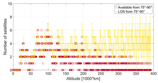 Visible satellites (in the line of sight (LOS)) and available satellites at the receiver’s position, for which the corresponding signal is transmitted at an angle between 75° and 90° from the transmitter’s boresight.