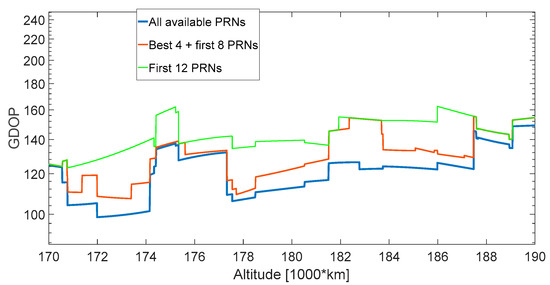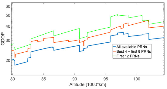 For a limited number of acquisition/tracking channels (i.e., the SANAG receiver should have at least 12 channels), in the lower part of the MTO it is not possible to process all the available signals; for altitudes lower than 187,000 km more than 12 signals are available, as shown in Figure 11. Figure 45 displays the GDOP in three different cases. In the best case, all the available signals are processed (see the blue curve in Figure 45). In the simplest case (see the green curve in Figure 45), the navigation solution is simply computed using the first 12 signals that the receiver processes (e.g., from 1 to 29, the first available PRNs). However, this is not optimal because, among the available signals, there are 12 that ensure the best GDOP. Theoretically, the receiver could predict the combination of 12 signals (among the ones available) that provides the best GDOP, but the associated computational burden may be too high to be performed in real time on board. A less computationally expensive but still effective method is to find the four signals that provide the lowest GDOP and include them in the 12 processed (the brown curve in Figure 45). Figure 46 is a zoomed-in view of Figure 45 between 80,000 km and 105,000 km. For instance, we can see that including the four available signals that give the best GDOP in the 12 processed, instead of just using the first 12 signals that the receiver finds chronologically, provides a GDOP of 35 instead of 48 at 96,000 km (see Figure 46) and of 129 instead of 155 at 187,500 km (see Figure 47).