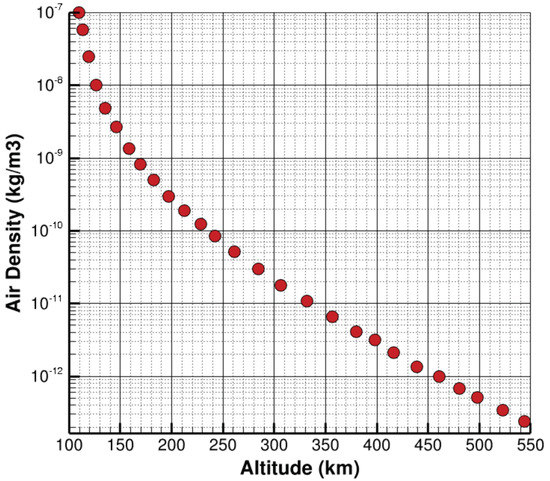 The so-called ‘Karman line’, defined to be at an altitude of 100 km above the Earth, is commonly regarded as the boundary between the Earth’s atmosphere and space. In reality, the density of the Earth’s atmosphere undergoes a significant decay beginning at an altitude of 20 km and a highly rarefied vestige of the atmosphere extends well beyond the Karman line and into the region of LEO, as illustrated in Figure 2. As a consequence, spacecraft in very low orbits are subject to a ballistic drag force from the residual atmosphere. While small in magnitude, the effect of atmospheric drag is to reduce the velocity of an orbiting object and, given sufficient time, leads to an orbital decay and eventual atmospheric reentry. A model of ballistic drag is typically employed to describe this effect and is given by [32]: