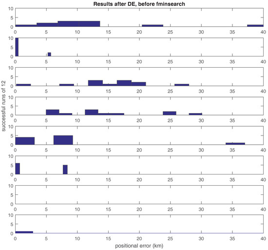 Histograms of the positional error (in km) in the test Problems #1–4 after differential evolution (DE) but before refinement with fminsearch, for all trials that were within 40 km of the target after DE. There were 12 trials performed for each of the test problems.