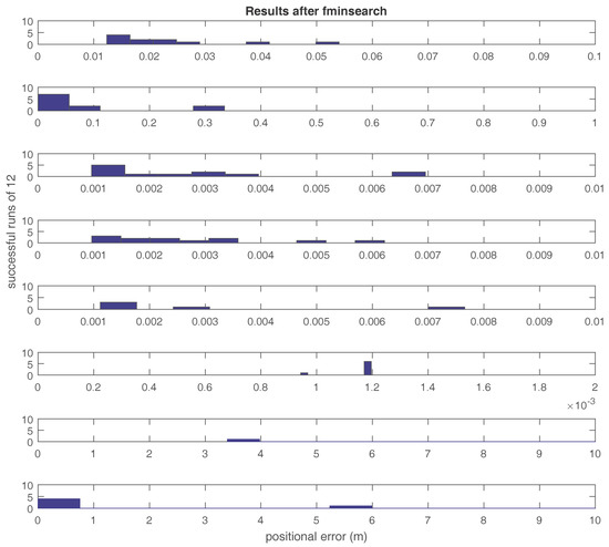 Histograms of the positional error (in m) in the test Problems #1–4 after DE followed by refinement with fminsearch.