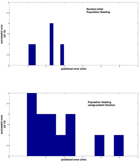 Histograms of the positional error (in mm) in the test Problem #4a showing the improvement in success rate between random population initialization (top) and initial population based on the Lambert solution (bottom).
