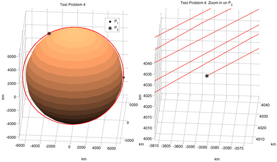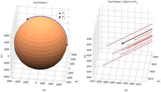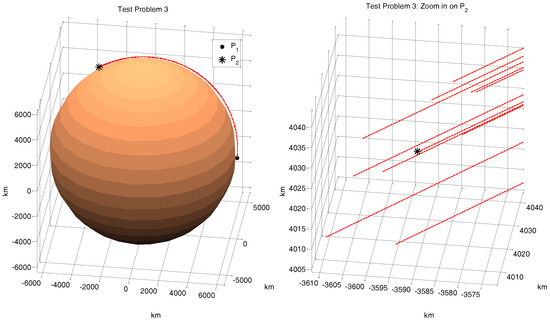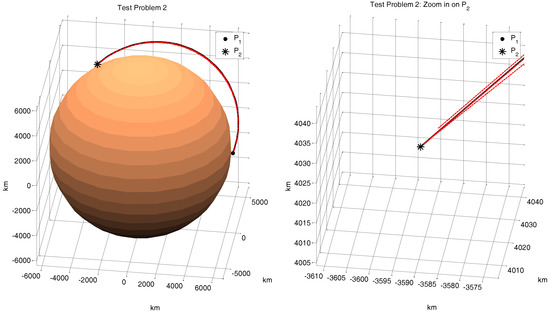 Upon examination of the results, three types of results were apparent: (i) infeasible trajectories that ended up at but that intersected the Earth (this occurred only once, for Problem #1), (ii) trajectories that ended up hundreds or thousands of km from (this occurred in 7 of the 12 trials of the multi-orbit Problem #4a without Lambert-based initialization), and (iii) feasible trajectories that ended close to the target location (in all but one case, these were much less than 1 m from the target and were therefore considered successful trials).